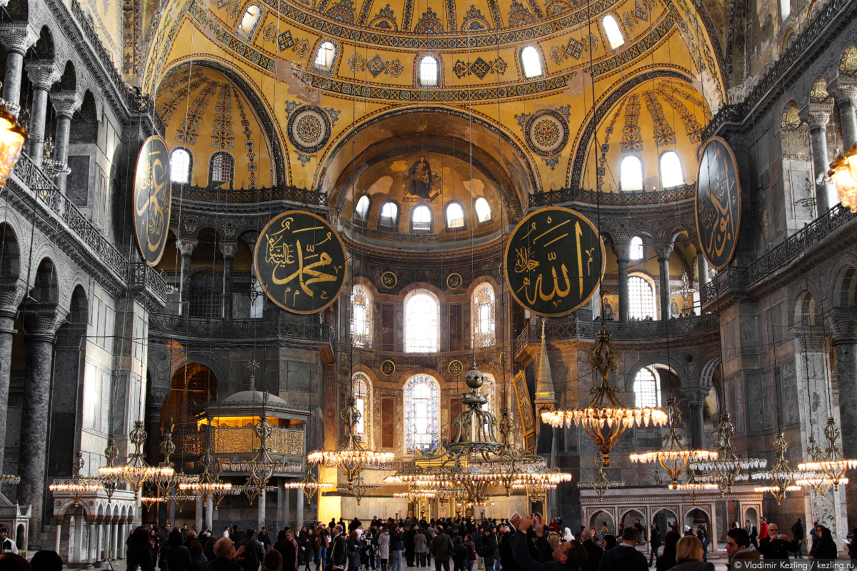 В Стамбуле хочется увидеть все. Конечно же, первым пунктом должна стать Айя София. Скажем кратко: гениальное творение византийских мастеров VI века производит колоссальное впечатление. Снаружи она выглядит тяжеловатой из-за массивных каменных конструкций, усиливших здание в XVI веке. Но какое пространство внутри, какая легкая устремленность ввысь! Кажется, что гигантский купол не опирается на мощные пилоны, а парит в воздухе.