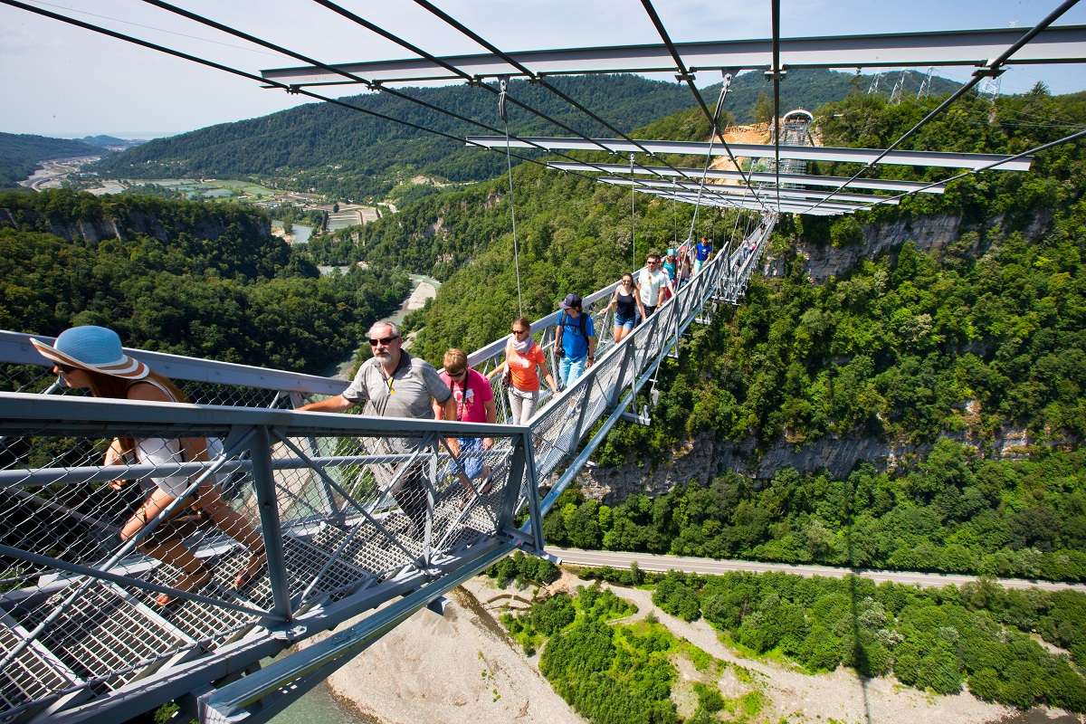 Скайбридж подвешен над долиной реки Мзымта. В переводе с черкесского ее название означает - бешеная, и это определение полностью оправдывает ее характер.