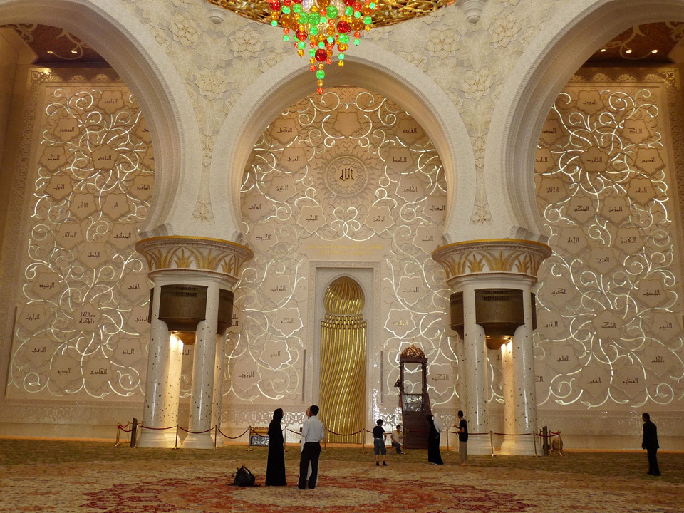 На знаменитой стене Кибла представлено 99 имён Аллаха. Центральная ниша изготовлена из мозаичного стекла и чистого золота. Здесь же располагается самый огромный ковёр в мире, выполненный вручную, а также люстра, переливающаяся тысячами камней Сваровски.
