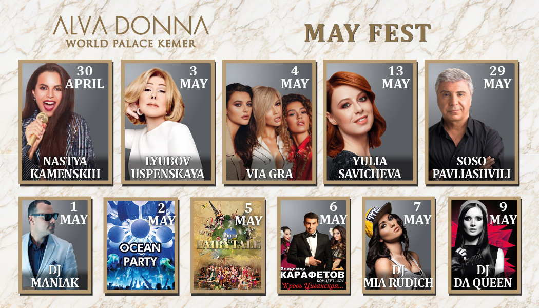 В даты с 30 апреля по 9 мая особенно классно ехать, когда будут происходить увлекательные шоу каждый день. Новые знакомства, море впечатлений и эмоций ждут Вас на Май Фест 2019 в отеле Альва Донна Ворлд Палас 5*, так что бронируйтесь прямо сейчас, и отправляйтесь, возможно, на Ваш самый лучший отдых!