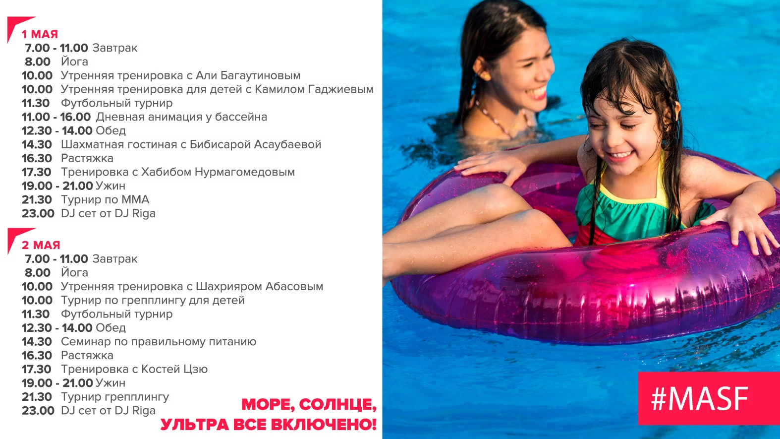 Каждый день будут проходить увлекательные тренировки для взрослых и детей, а так же различные мастер-классы, семинары и рекомендации по питанию, игры в футбол, волейбол, теннис, йога, пилатес, плавание и др.